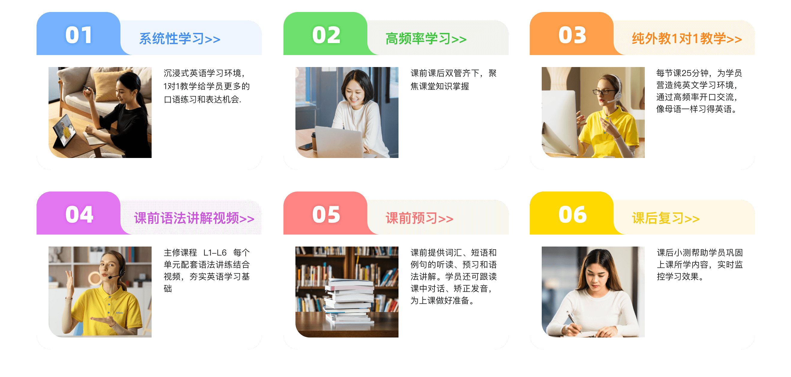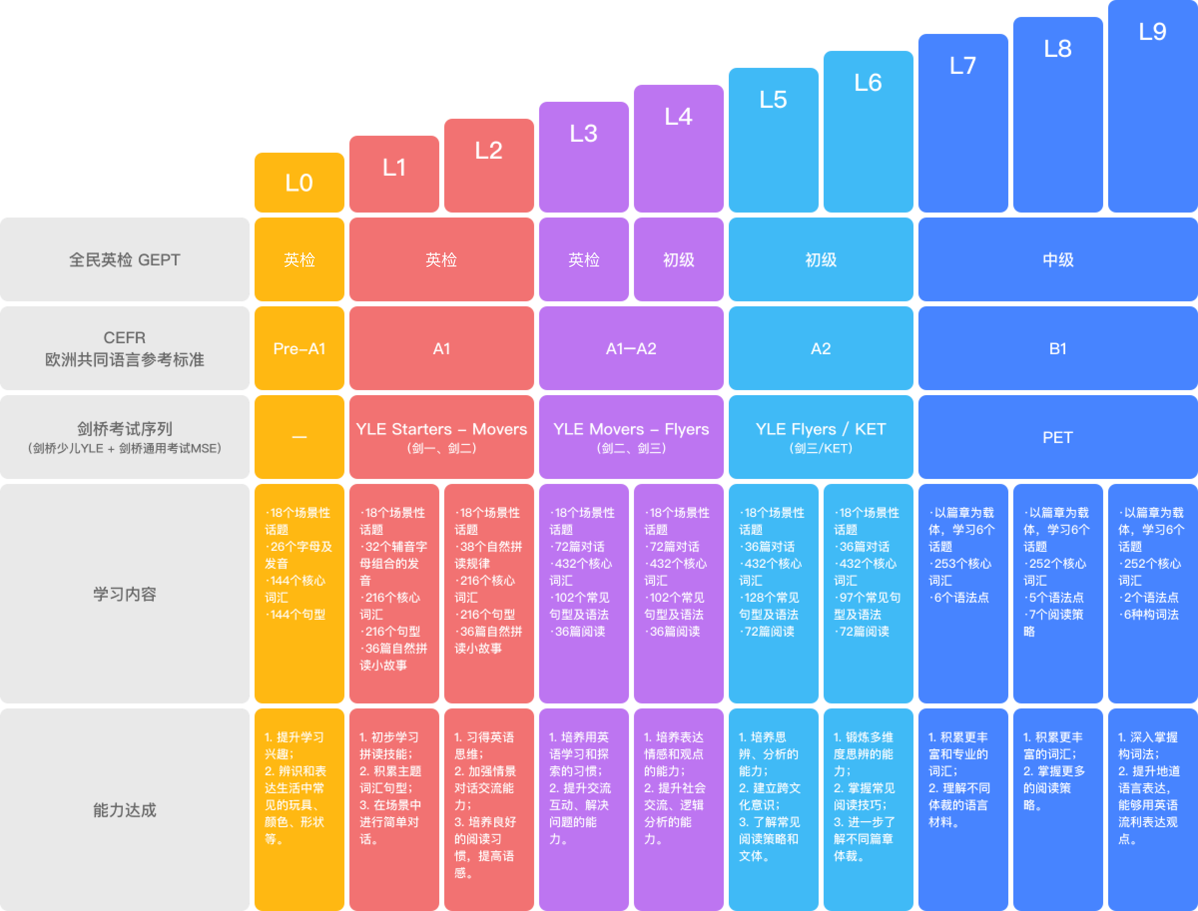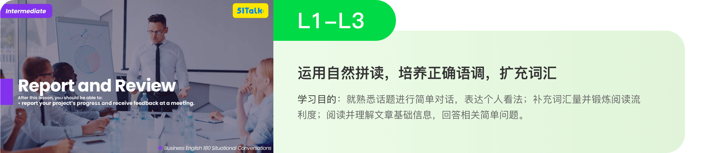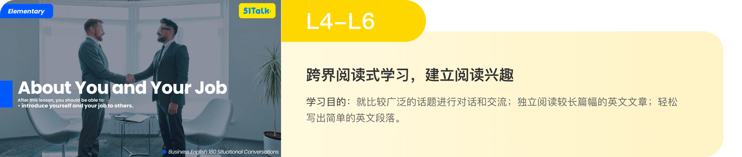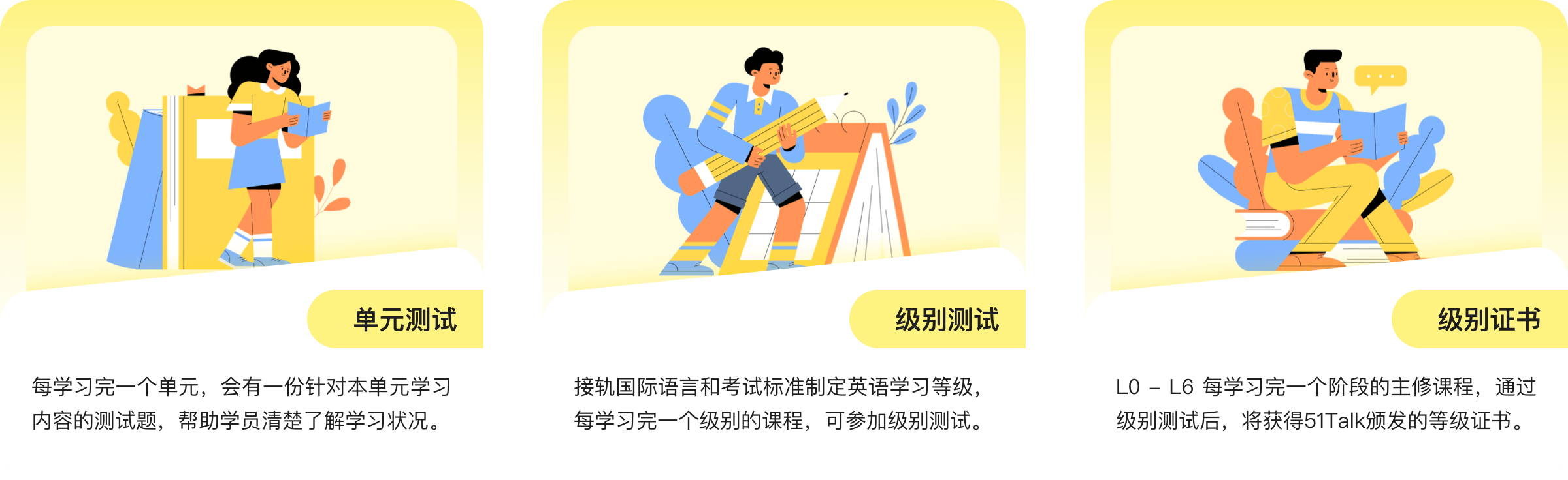 本课程体系为51Talk经典英语 基于CEFR(欧洲共同语言参考标准)为全球学员专业研发的英语课程体系,接轨剑桥英语和剑桥通用英语等国际考试,为每位学员的英语学习提供清晰可衡量的成长进步计划。